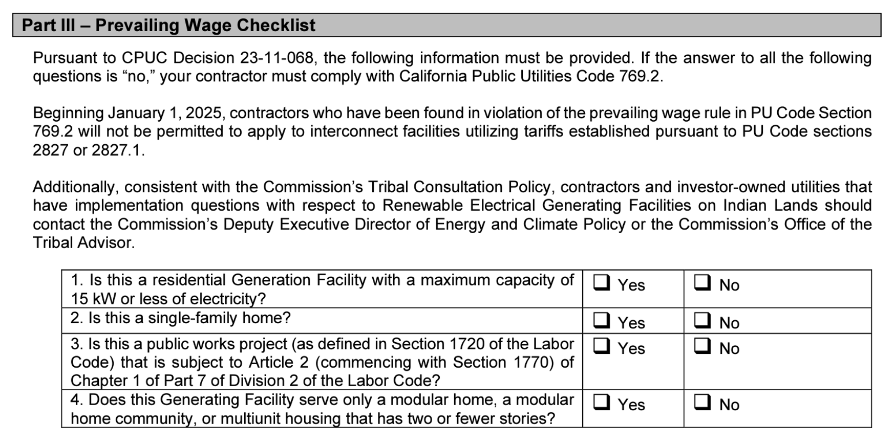 The utilities have created a simple checklist that applicants complete as part of the interconnection process to determine whether or not the project must comply with AB 2143. The checklist created by the utilities is as follows: