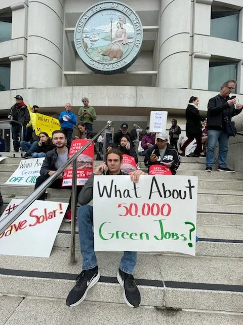 Now, as the CPUC reconsiders rooftop solar changes, solar advocates are seeking transparency in the process and answers. During Thursday’s “phone-in,” hundreds of solar supporters around the state waited on-hold to make public comments during the CPUC’s virtual meeting. Outside CPUC headquarters, dozens of activists also called into the meeting while holding signs with questions for the CPUC like “what about real energy equity”, “what about climate leadership”, and “what about getting to 100% renewable”.